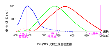 1931年國際照明委員會(CIE)規定紅、綠、藍三種原色光的波長分別為:700nm、546.1nm、435.8nm。為了理論闡述上的方便,我們把這三種原色光的位置標記在“視網膜視錐細胞的光譜吸收曲線圖”上,(見下圖)。在這張