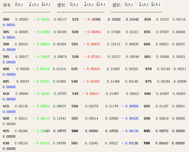 通過這一段分析可以看出,從546.1nm到690nm這一段,b的數量是由0開始增加,之后又減少,到了690nm處的時候減少到0。顯然b在這區間內肯定要有一個*大值。現在,我們來看一下“光譜三刺激值”表中的546.1nm到690nm這一段,其中起輔助作用的光的“藍原色”的數量的變化(即,藍色三刺激值的變化),不*是這樣的一種情形嗎?它有一個*大值*發生在545nm處,數值的大小是0.00138(在表中我們對這個*大值中的138標了黑色,目的為了便于重新查找它。至于這個“刺激值”的負號來源,也*無需再作解釋了)。